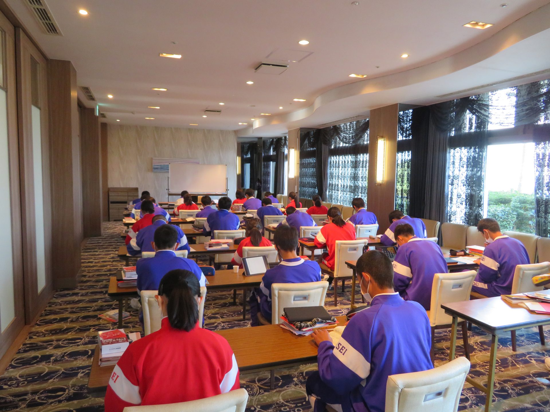 生徒は緊張した様子でホテルにて開校式を行いました。昼食後、オーシャン会場で早速学習を開始しました。