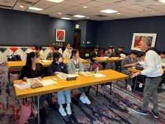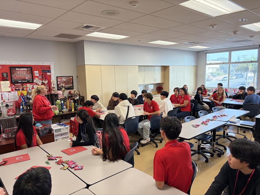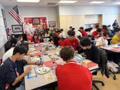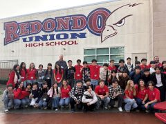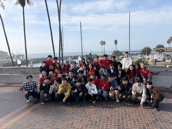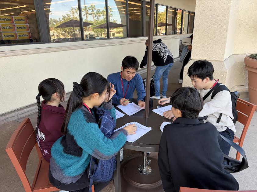 4日目の18日(木)は、いつもより早い7時10分にスタディーセンターに集合して現地のレドンド・ユニオン高校という高校に訪問しました。学校の校門から大歓迎を受け、控え室で案内の生徒たちの紹介、生徒たちとのグループ分けと交流の後、各グループごとに授業を見学しながら校内を回りました。クッキング、社会科、情報・放送の授業を見学しました。見学後は学校近くの海岸に散歩に行き、記念写真を撮った後に学校に戻り、美術の特別授業をしていただきました。先生の指示通り色を塗っていくと一枚の絵が完成するという物です。その後、メキシコのタコスの昼食をいただき、スタディーセンターに戻りました。戻った後は通常の授業を受けて1日が終了しました。とても充実した一日だったと思います。