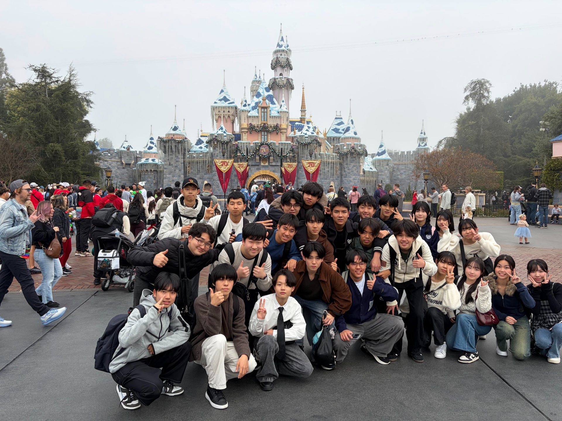 12月20日(土)、21日(日)はそれぞれのホストファミリーとの時間を過ごして、本日22日(月)は最後のアクティビティーであるディズニーランドでした。土曜日と日曜日も無事にホストファミリーと過ごしたようで、週明けの本日も全員元気に集合しました。今朝は霧がかなり濃くかかっていたので天気の心配をしましたが、昼にかけて晴れてきたのでよかったです。みんな最後のアクティビティーを楽しみにしていたようで、疲れも見せずに元気いっぱいでした。かなり混雑していて、アメリカでのクリスマスシーズンの雰囲気を十分感じることができたと思います。