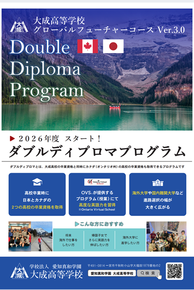 ダブルディプロマプログラムとは、大成高校の卒業資格と同時にカナダ(オンタリオ州)の高校の卒業資格も取得できるプログラムです。