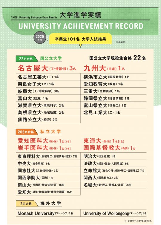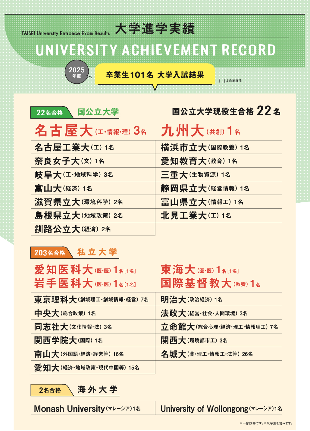 進学情報 大成の実力と成果 進学実績 本年度入試におきましても多数の卒業生が現役合格を果たし、国公立大学の現役合格率も高い実績を残しています。 ヒマラヤの銀嶺を表現する本校の校章。その最高峰をめざした先輩たち。彼らの、強い意思の結果です。 今年も将来への無限への可能性を秘めて成長し続けています。 STUDY+IDEA=STUDEA<より高い理想をもった学習を>をモットーに、今後もさらに大きく飛躍していきたいと願っています。 2025年度卒業生 2024年度卒業生 2023年度卒業生 2022年度卒業生 2021年度卒業生