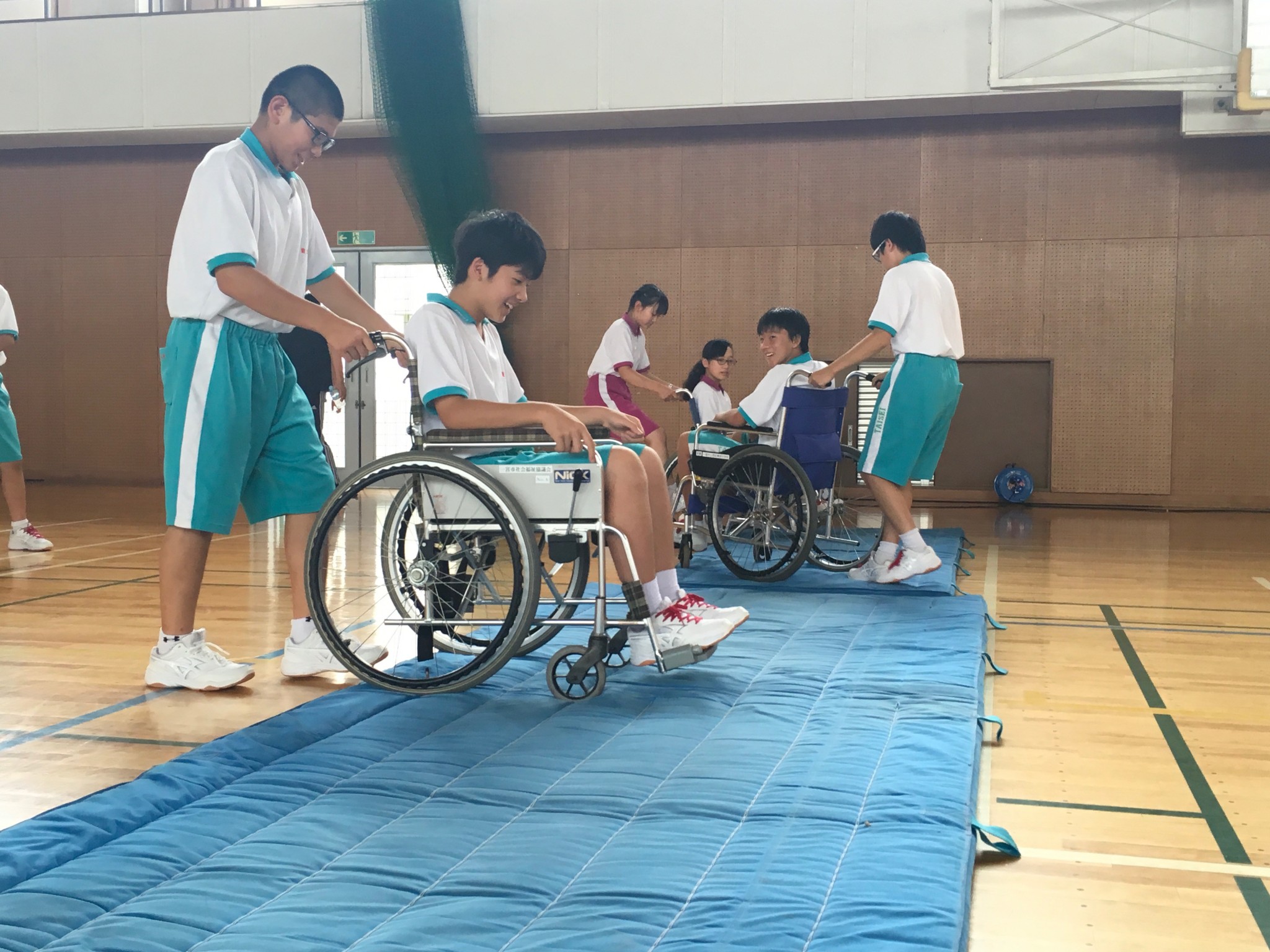 2018年7月11日2018年8月28日 福祉体験【中2】 7月11日 本日、大成中学校では中学校2年生が福祉体験の一環として車いすの講義および実技を行いました。 生徒たちは実際に車いすを使用されている方からのお話しを聞き、ふれあう中で すべての人びとがともに生きていくとはどんなことかを考えるきっかけとなったことでしょう。