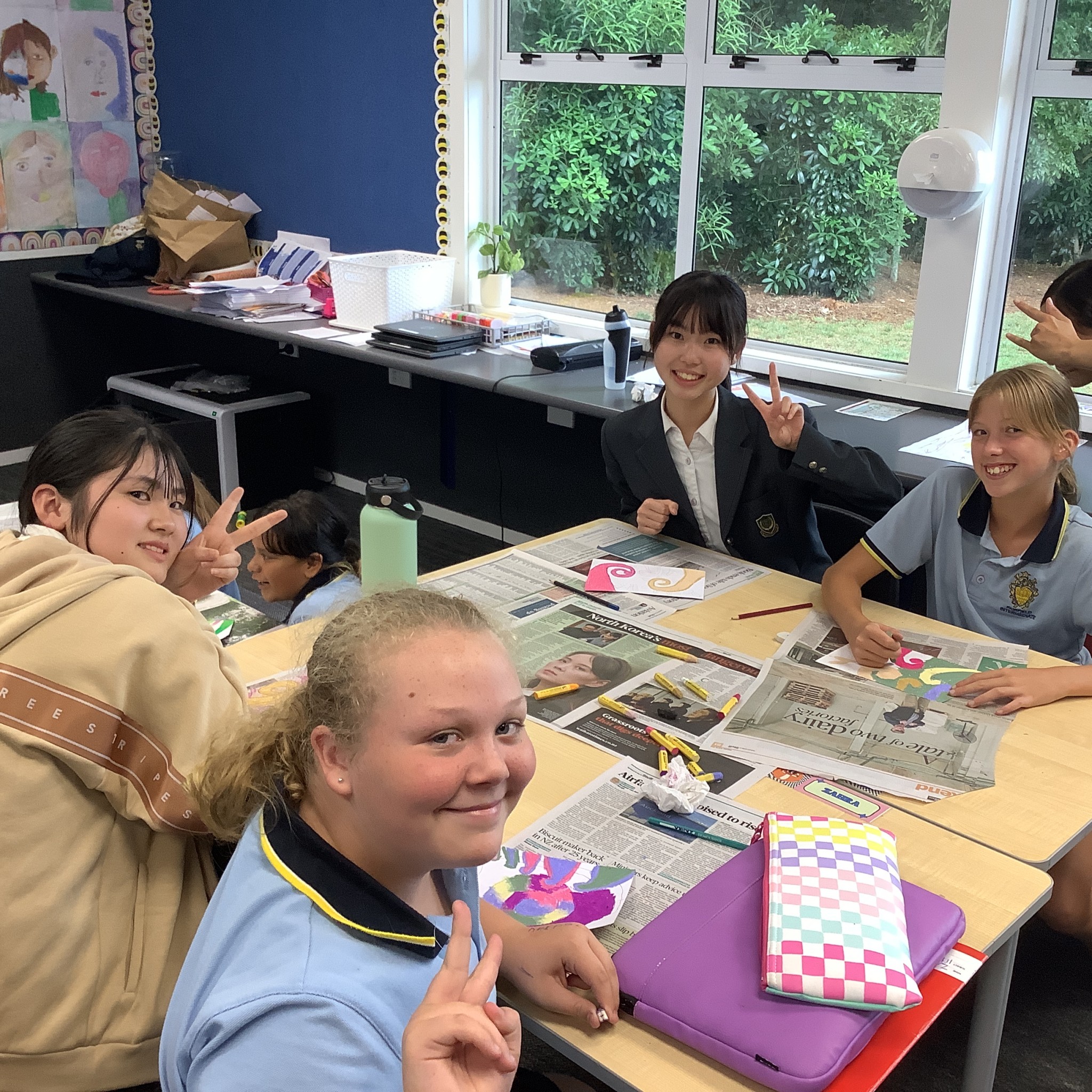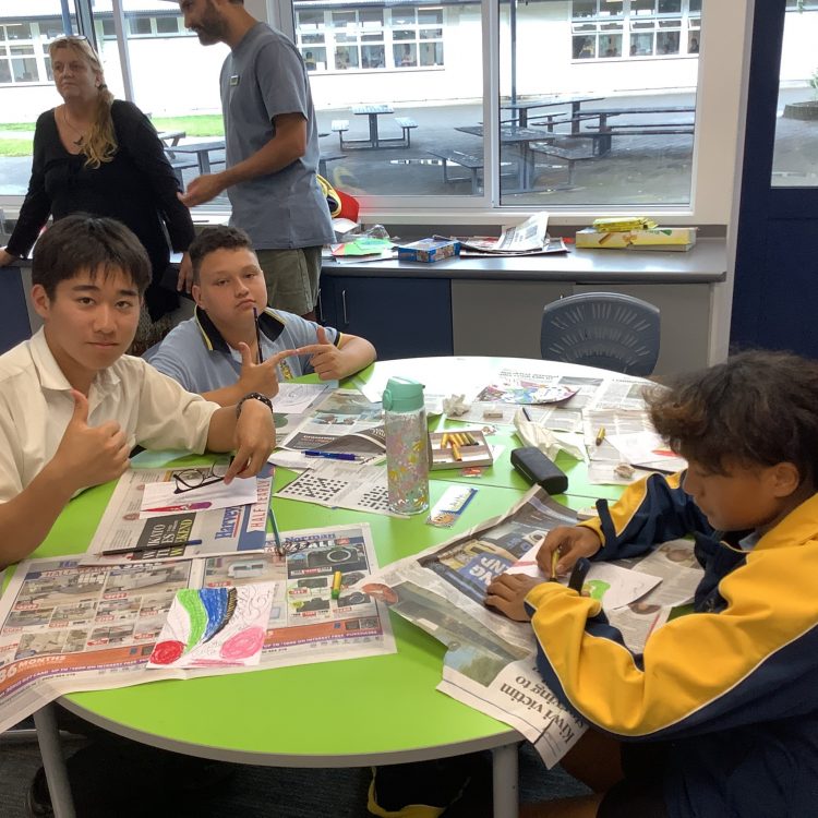 授業のテーマは「新聞」でした。生徒たちは2人ずつのグループに分かれて、それぞれが新聞の一部を制作しました。それぞれのグループが作成した一部を合わせると、1枚の新聞が完成しました。スポーツページを作ったチームや、広告ページやヘッドラインページを担当したチームなど、様々な役割分担がありました。生徒たちは一生懸命完成させ、立派な新聞を作り上げました。